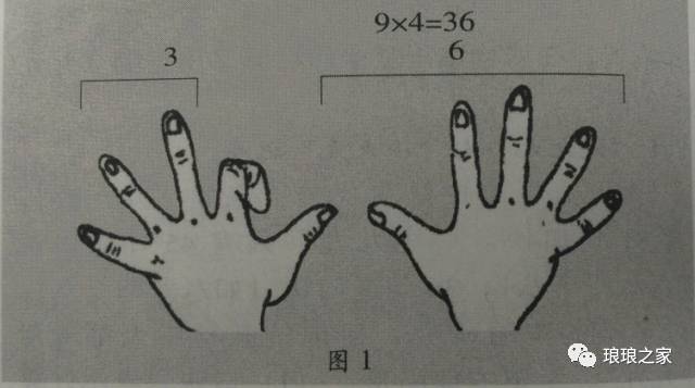 如图1,从左至右第4个手指向前弯曲,左边3个手指表示30,右边6个手指表示6,所以9×4=36。