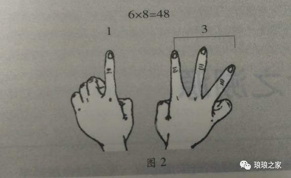 如图2,左手伸出1个手指表示6,右手伸出3个手指表示8。两手伸出的手指数表示结果的十位数4,双手握住的手指数相乘(4×2)表示结果的个位数8,所以结果是48。