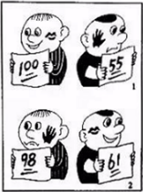 第三步:议。 议就是根据漫画主题,联系现实生活中的类似实际事例,发表议论。看到下面这幅图,联系现实生活,我感慨万千:漫画中孩子手持分数,脸呈伤痕,其中折射的仍旧是教育痛伤“唯分数论”这种缺陷的评价方式。曾几何时,“狼爸”“虎妈”一直“霸屏”,也霸占了孩子们的整个童年。造成“唯分数论”观念形成的是整个社会的戾气与暴躁。孩子因成绩低下,遭受打脸。打的是孩子的脸,红的却应该是家长的脸,因为这是一种简单粗暴的教育方式。一味地责备孩子,或只是成绩上升的表扬,成绩下降的责打,都只能是治标不治本。在对待孩子的教育问题上,更需要“匠人精神”的耐心与执着。