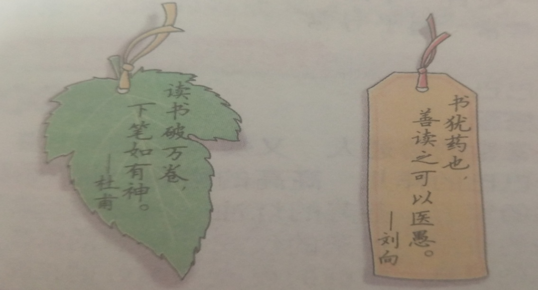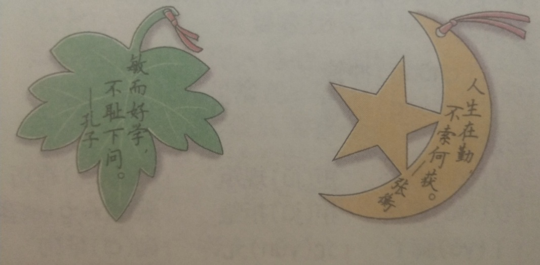 三、书写提示 做几个有趣的书签,在书签上写一句你喜欢的格言。 名师指导:首先,准备几张色卡纸,在纸上画出自己喜欢的形状,再用剪刀剪出这些形状,可以是树叶形,可以是长方形,也可以是心形,还可以是不规则形状。然后,在书签的顶端打上孔,系上丝带或绳子。最后,在书签上写一句自己喜欢的格言。 书写时要注意: 1.竖写与横写的书写顺序不同,要自右向左书写; 2.为保证美观,书写时字距要均匀,上下字要对齐; 3.作者名字要写在书签的左下方,并用破折号引出,使书签更美观。你也快来试试吧?