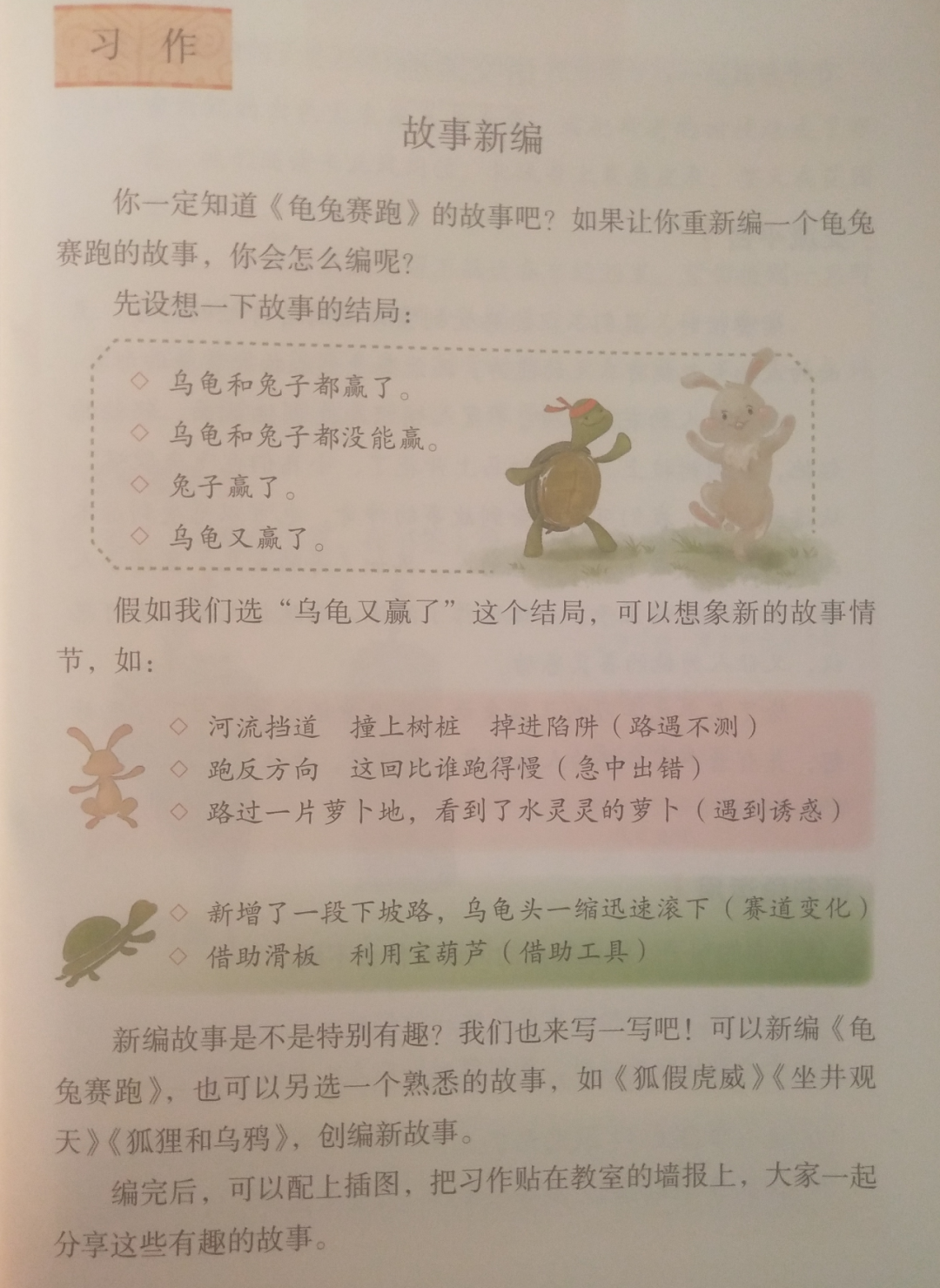 二、习作内容 本次习作要求新编一个故事。可以新编《龟兔赛跑》,也可以另选一个熟悉的故事,如《狐假虎威》《坐井观天》《狐狸和乌鸦》,创编新故事。编完后,可以配上插图。
