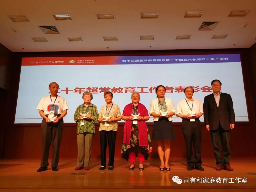 司有和(左一)在中国人才研究会超常人才专业委员会2018年第十四届超常教育年会获得“中国超常教育二十年”荣誉,此为颁奖现场