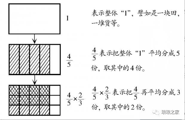 根据上面图解,我们可以清楚地看出是由分数乘法的意义(求一个数的几分之几是多少)决定的,分母乘分母表示单位“1”一共平均分成几份,先平均分成5份,再平均分成3份,一共平均分成15份;分子乘分子表示一共取其中的几份,先取4份,再扩大2倍,一共取8份。