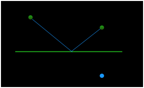 在右边那个点给它一个镜像,也就是给它一个对直线来说对称的点,因为这个蓝色的点和直线上面它对称的那个绿色的点对于这个直线的位置是一样的,所以我们从左边这个绿点到右边这个绿点就可以转换成从左边这个绿点到右边这个蓝点,两点之间最短的距离是一条直线,它与原来那条直线有个交点,这个点连上直线上面左右两个绿点的直线间距离就是我们要画的最短的距离。