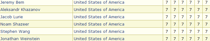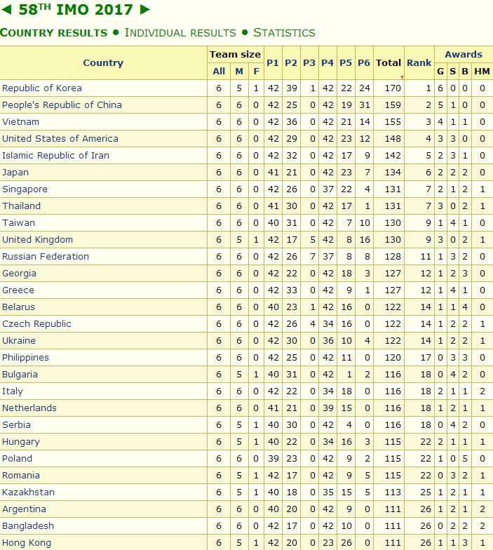 另外,任何比赛都有偶然性,特别是一些偏题,可能准备不到,今年IMO第3题(奥地利供题)只有7人得分:7,7,5,4,1,1,1。其余608人都是0分,完全答对的两名选手来自澳大利亚和俄罗斯,这两国的团队排名就不高了。