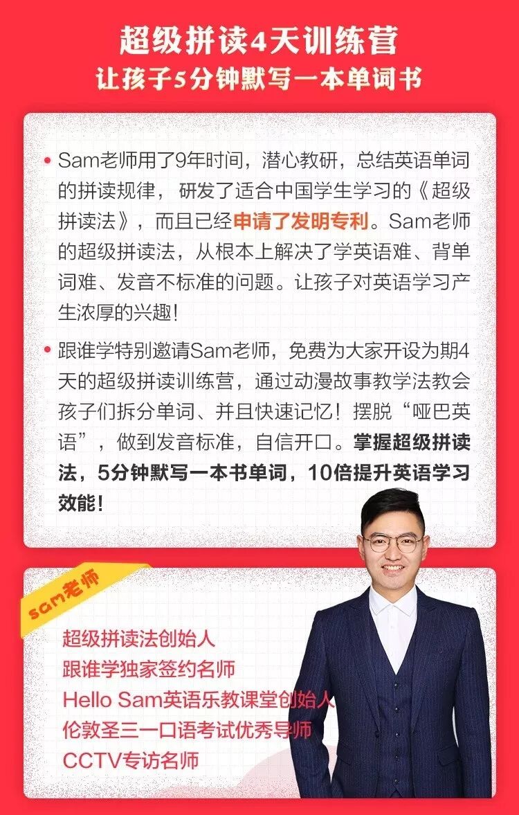 就在我绝望之际,偶然看到一篇《超级拼读,4天英语训练营》的文章推荐英语课程,Sam老师讲到了用动画+讲故事的方式,教孩子快速记忆单词的技巧……
