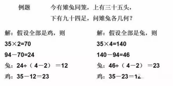 假设是先对题目中的已知条件或问题作出某种假设,然后按照题中的已知条件进行推算,根据数量出现的矛盾,加以适当调整,最后找到正确答案的一种思想方法。假设思想是一种有意义的想象思维,掌握之后可以使要解决的问题更形象、具体,从而丰富解题思路。