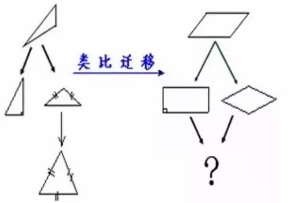 类比思想是指依据两类数学对象的相似性,有可能将已知的一类数学对象的性质迁移到另一类数学对象上去的思想。如加法交换律和乘法交换律、长方形的面积公式、平行四边形面积公式和三角形面积公式。类比思想不仅使数学知识容易理解,而且使公式的记忆变得顺水推舟般自然和简洁。